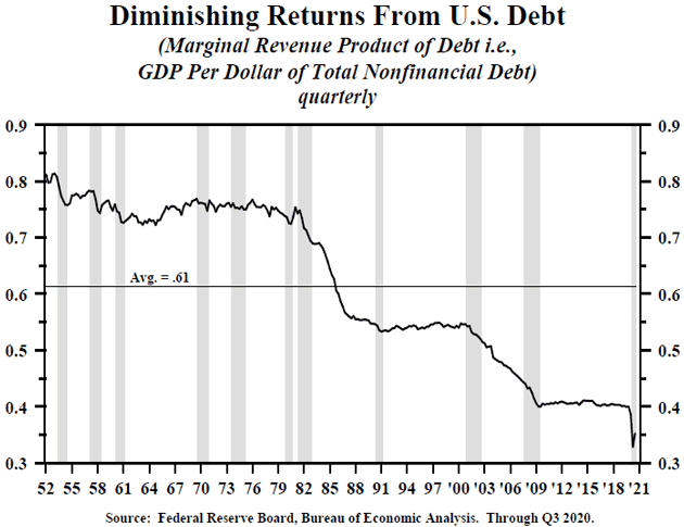 Consumentenprijsinflatie liet het bovendien helemaal afweten, omdat de omloopsnelheid van het geld ('velocity'), zelfs na 20 jaar van daling, bleef instorten naar een nieuw dieptepunt sinds 1946 (!). Het geld werd geen 'hete', maar 'koude' aardappel, omdat de gemiddelde burger wel aanvoelde, dat de tijd om erop los te leven, allang was verstreken. De onzekerheden over werkgelegenheid en de oude dag versterkten overal de spaarcultuur, ondanks de lage of negatieve rente. Bovendien was er helemaal geen sprake van een loon- en prijsspiraal, zoals in de jaren '70, vanwege de concurrentie van China sinds 2001, na hun toetreding tot de Wereldhandelsorganisatie (WTO). Na de huidige economische depressie van COVID mag men trouwens van geluk spreken, als men nog een baan heeft!